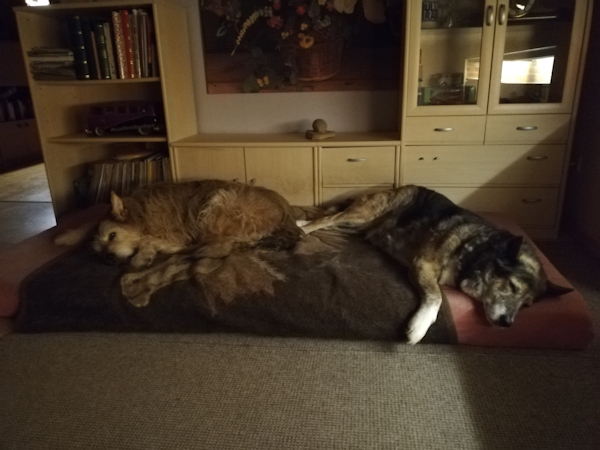 Nachts schläft er da wo wir sind, steht morgens um 4 Uhr mit uns auf, schnell auf, in den Garten gehen, Althunderudel eben, und schläft dann mit uns wieder ein.