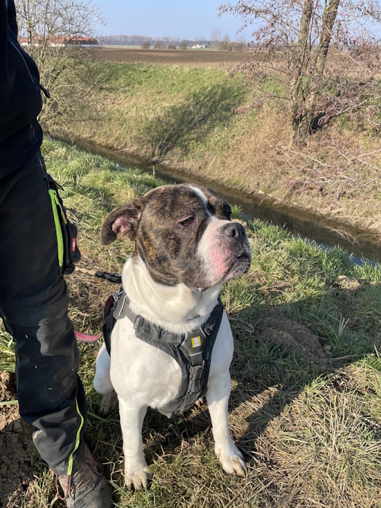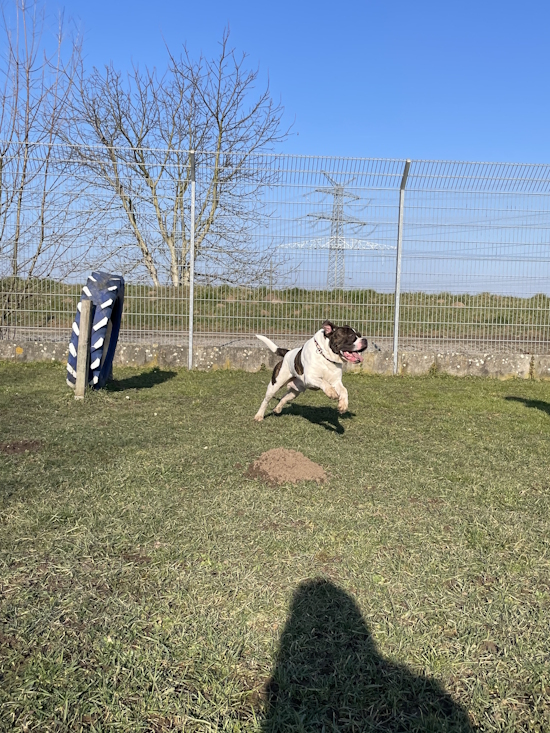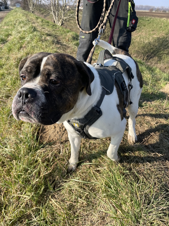 Er ist leider noch nicht wirklich leinenführig, daher braucht man einen festen Griff. Generell wurde ihm bislang viel Freiraum gelassen, ein paar Basics sollte er noch lernen.