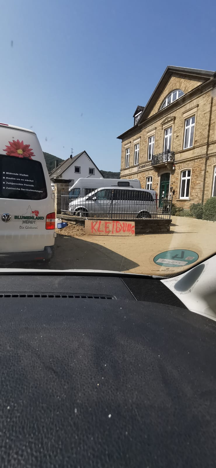 Ein weiterer Dank geht an die Firma Strabag, die unsere Sache mit etlichen Kanistern, Besen, Gummistiefeln und vielen weiteren Dingen unterstützt hat, die die Menschen vor Ort am ehesten gebrauchen konnten. Zudem bedanken wir uns auch bei unserem langjährigen Gassi-Geher Andreas Bertsch, der uns nicht nur in das betroffene Gebiet begleitet hat, sondern auch seinen Chef vom ortsansässigen Blumenland Herdt über unser Vorhaben informierte. Dadurch hatten wir einen weiteren vollgetankten Transporter und wir konnten mehr Spenden transportieren, als ursprünglich geplant war. Einfach: DANKE!