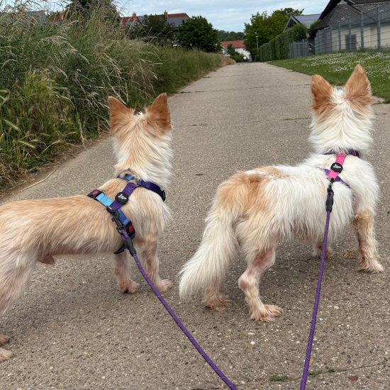 Beide sind neugierig, aufmerksam und genießen ihre Spaziergänge. Sie laufen gut an der Leine und zeigen Interesse an ihrer Umgebung. Bewegung tut ihnen gut, und sie sind gerne unterwegs.