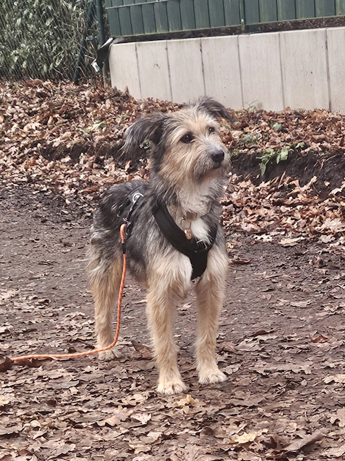 Sie ist im Tierheim aufgewachsen und blüht nun in ihrer Pflegestelle in Dietzenbach bei Frankfurt am Main auf. Neue Erlebnisse saugt sie auf wie ein Schwamm, hat aber noch Unsicherheiten, an denen gearbeitet werden sollte.