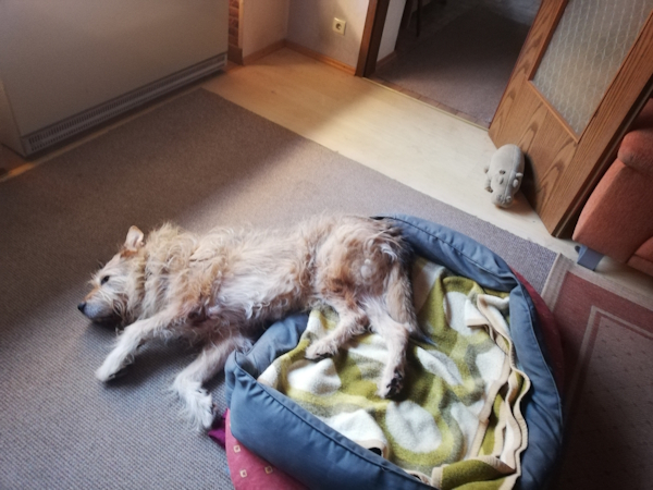 Nachts schläft er da wo wir sind, steht morgens um 4 Uhr mit uns auf, schnell auf, in den Garten gehen, Althunderudel eben, und schläft dann mit uns wieder ein.