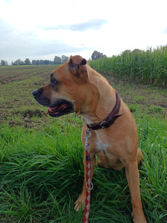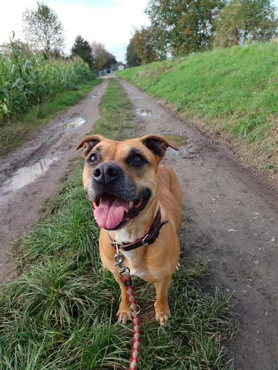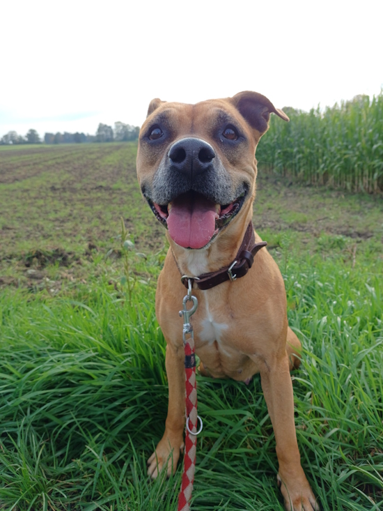 Die Staffhündin ist sehr lieb und aktiv. Bei fremden Menschen ist sie manchmal etwas unsicher. Andere Hunde mag sie meistens nicht. Wenn sie jemanden gut kennt, ist sie sehr verschmust und anhänglich.