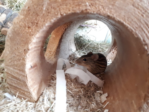 Eine weibliche und eine männliche Streifengrasmaus suchen getrennt ein neues Zuhause. Das Männchen ist nicht kastriert.