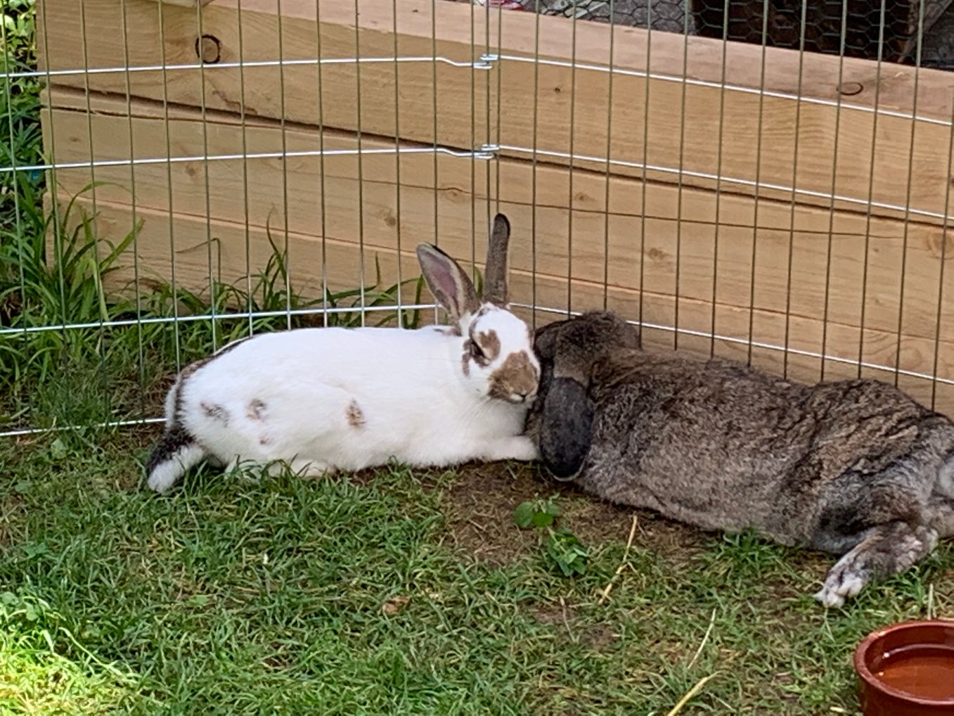 Lotte und Rolf haben sich von Anfang an gut verstanden. Sie haben inzwischen auch ein „Aussengehege“, in dem sie sich tagsüber, wenn wir dabei sind, bewegen können. Sie werden sehr umsorgt und verwöhnt und lassen sich zur Freude der Kinder auch gerne mal streicheln.