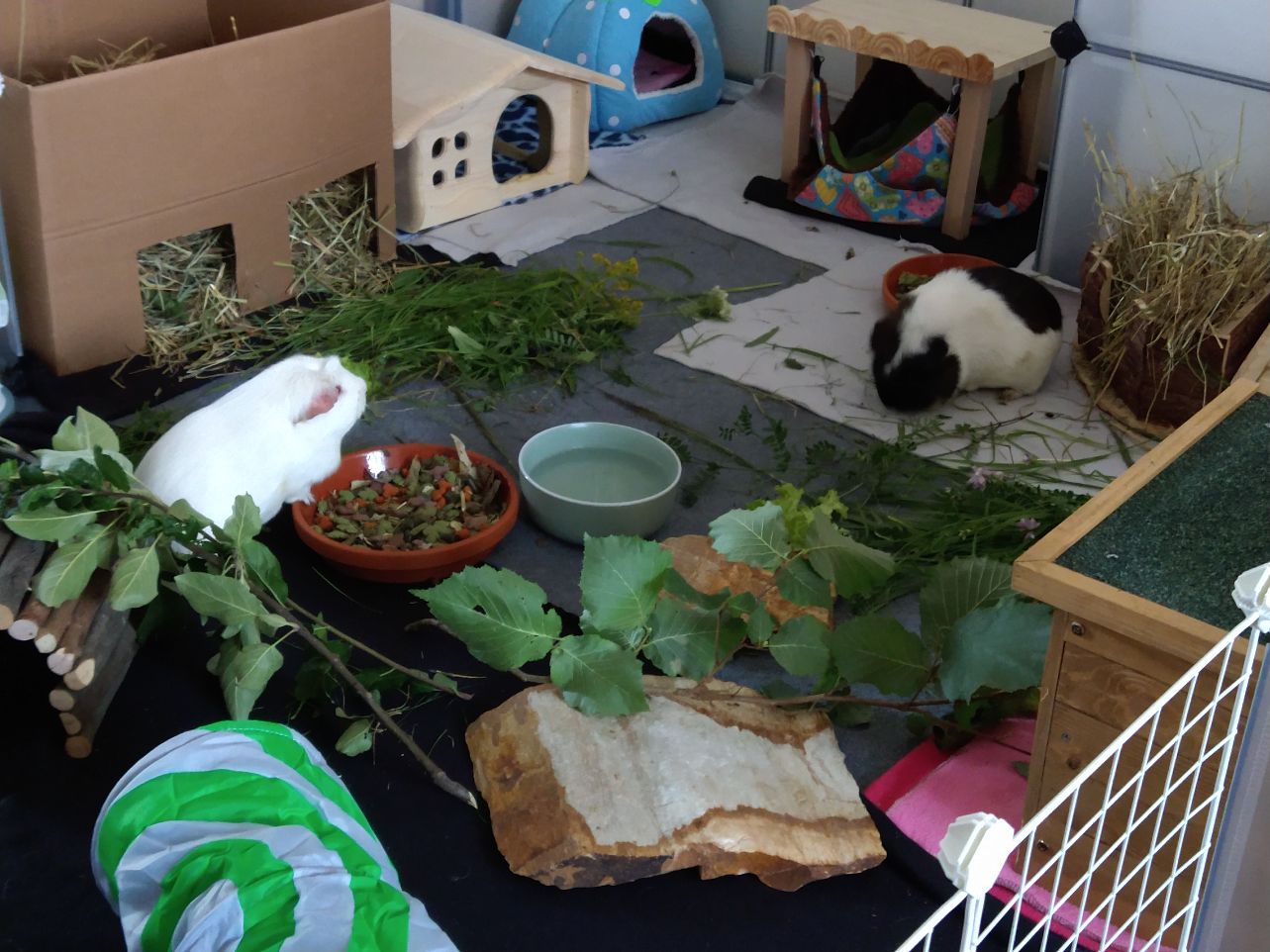 Sie werden immer zutraulicher ( vor allem Marshmallow genießt es unterm Kinn gestreichelt zu werden) und mampfen was das Zeug hält. Ihr Gewicht ist stabil und sie sind fit unterwegs