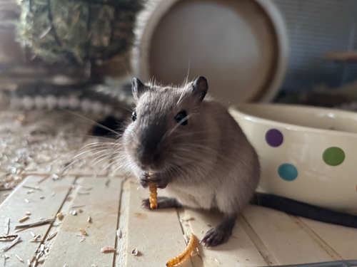 Da Rennmäuse sehr soziale Tiere sind, sucht Lotte ein Zuhause mit einer passenden Partnermäusin für eine Vergesellschaftung damit sie nicht allein bleibt.